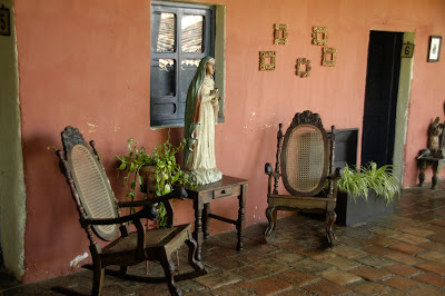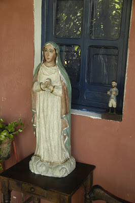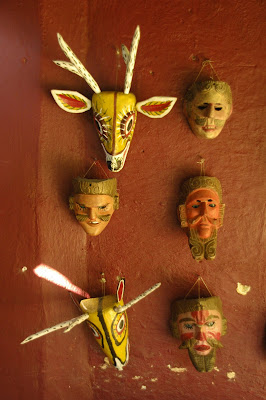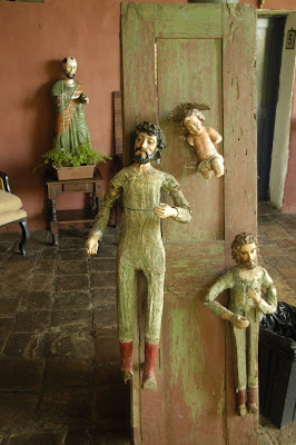 At last I arrived exhausted in Coban, where I am staying in a fascinating hotel that used to be a centuries old nunnery. It is built around a courtyard with trees and flowers, and there are all kinds of historic artifacts and masks from the area.
